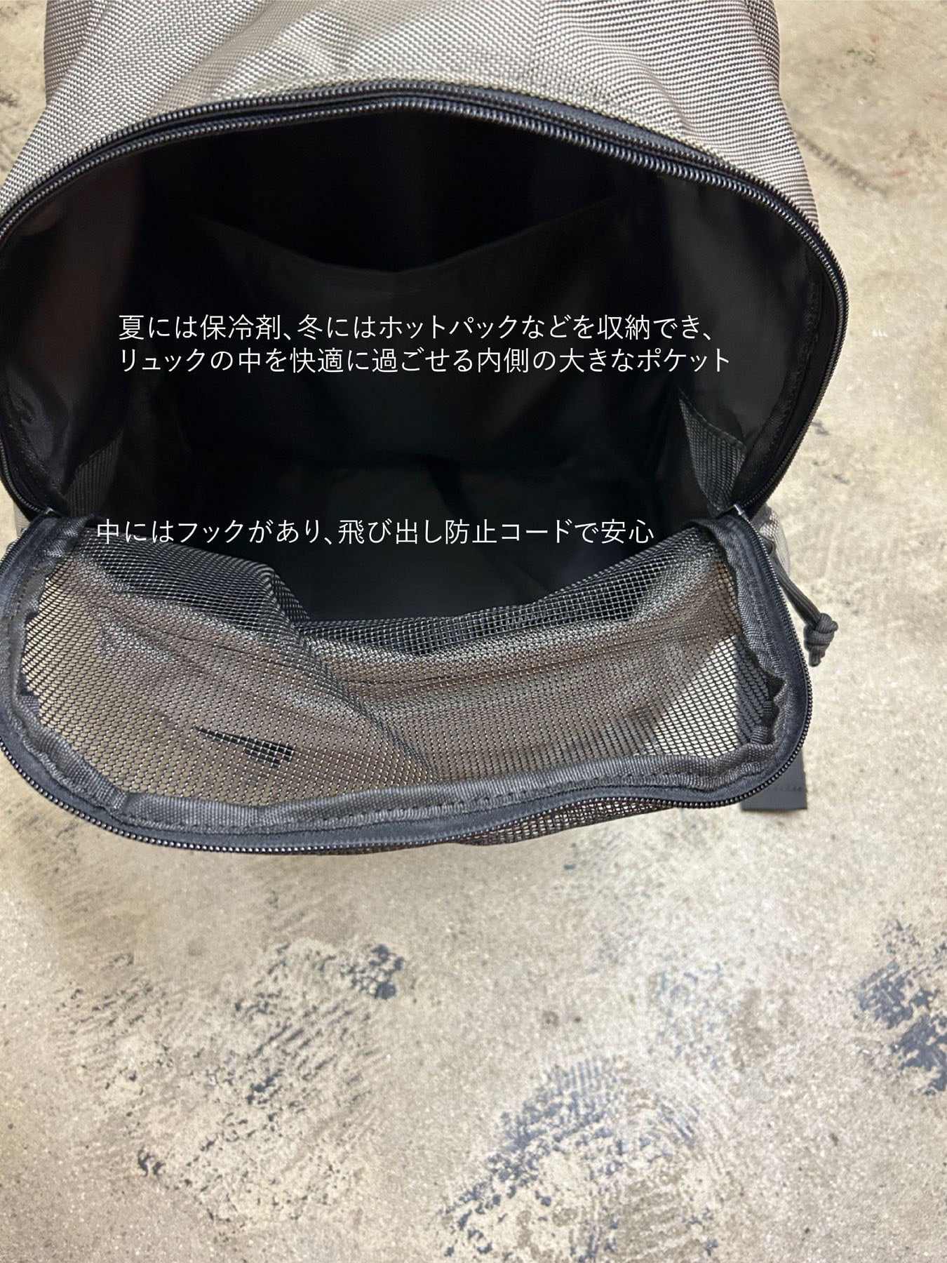 外フラップを開けるとメッシュフラップが出てきます。